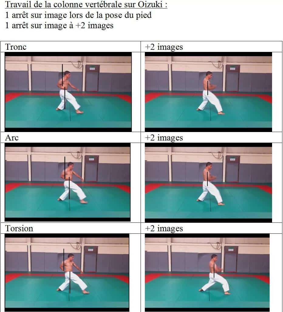 Mais une fois que l’on maîtrise bien Oi Zuki (et pas avant!!!), pourquoi ne pas libérer la colonne vertébrale de cette tension et utiliser également la puissance des muscles du tronc, (abdominaux, dos…) de façon dynamique, et non plus statique, afin de l’additionner à notre technique?